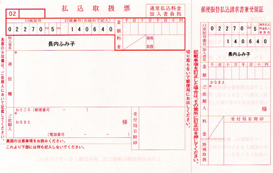 同封の赤色の払込取扱票(お客様の手数料は無料)でお振込みください。当方の講座番号・金額等の必要事項は記入してあります。 振込先 : 【ゆうちょ銀行】